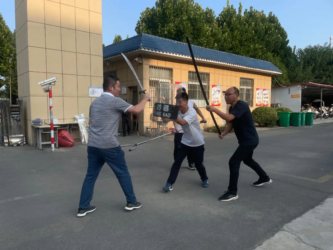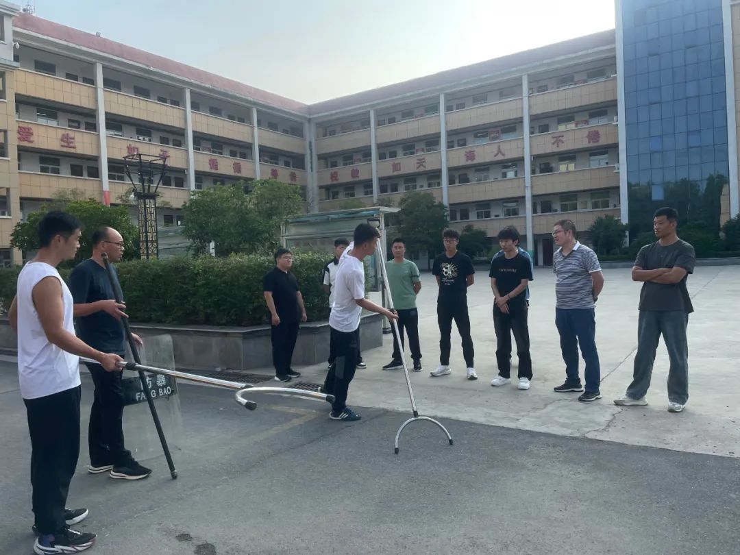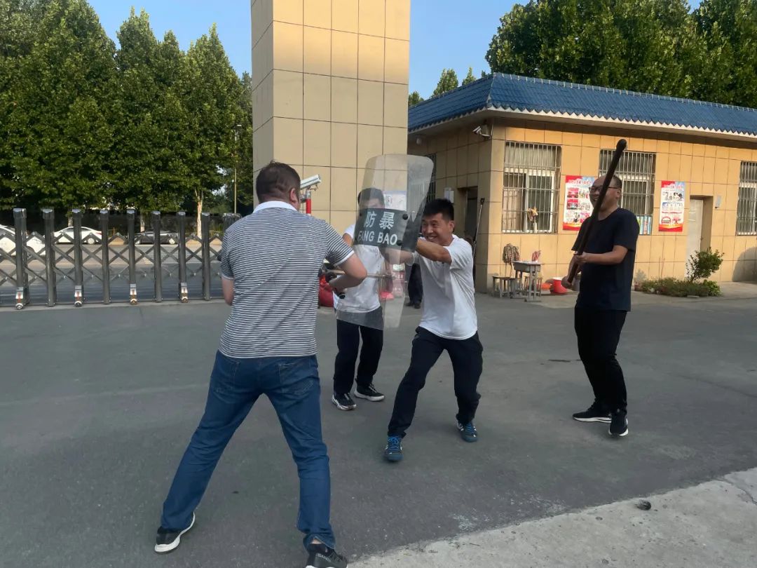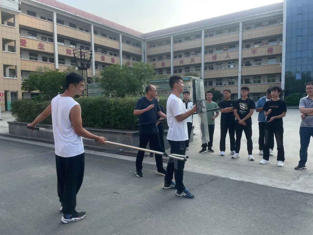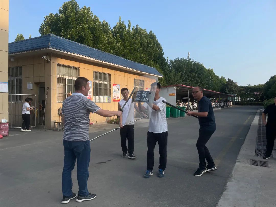 各位演练人员提早熟悉了演练方案和人员分配。政教处两位主任和郭老师对学校领导及其他老师进行防暴盾牌、钢叉、长棍等物防器械使用讲解,提高老师们与安保人员对物防器械的熟知与应用。